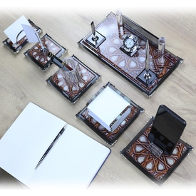 | İçerik: Kalem Seti, Telefon Standı, Küp Notluk, Notluk, Kalemlik, Kartvizitlik, Özel Lacivert Deri Kutu |